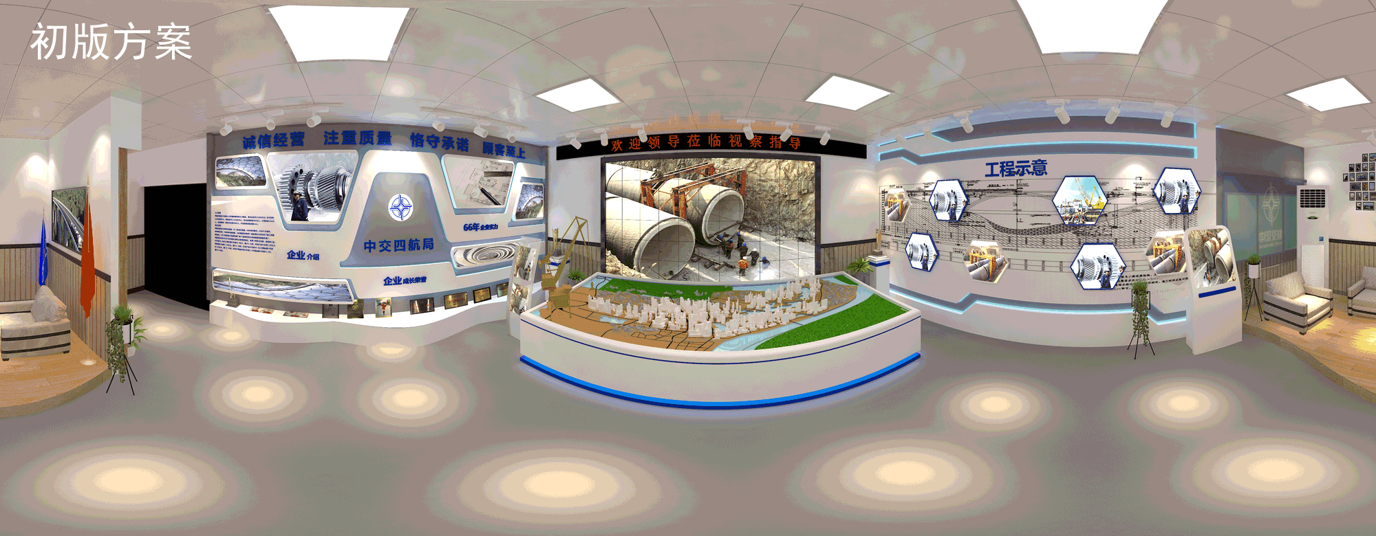 高清LED拼接幕墻,精細(xì)化動(dòng)態(tài)沙盤模型,高精質(zhì)巨型項(xiàng)目噴繪,VR創(chuàng)新技術(shù)應(yīng)用,整合多種傳播媒介,融合企業(yè)特色文化、企業(yè)榮譽(yù)實(shí)力展示、項(xiàng)目工藝創(chuàng)新等元素,實(shí)力打造多媒體互動(dòng)沉浸式體驗(yàn),360°全方位展示工程實(shí)況。